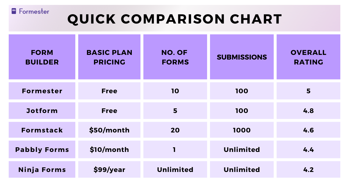 The Basic plan is free for upto 10 forms and 100 submissions, giving you the scope to explore and make the right decision.